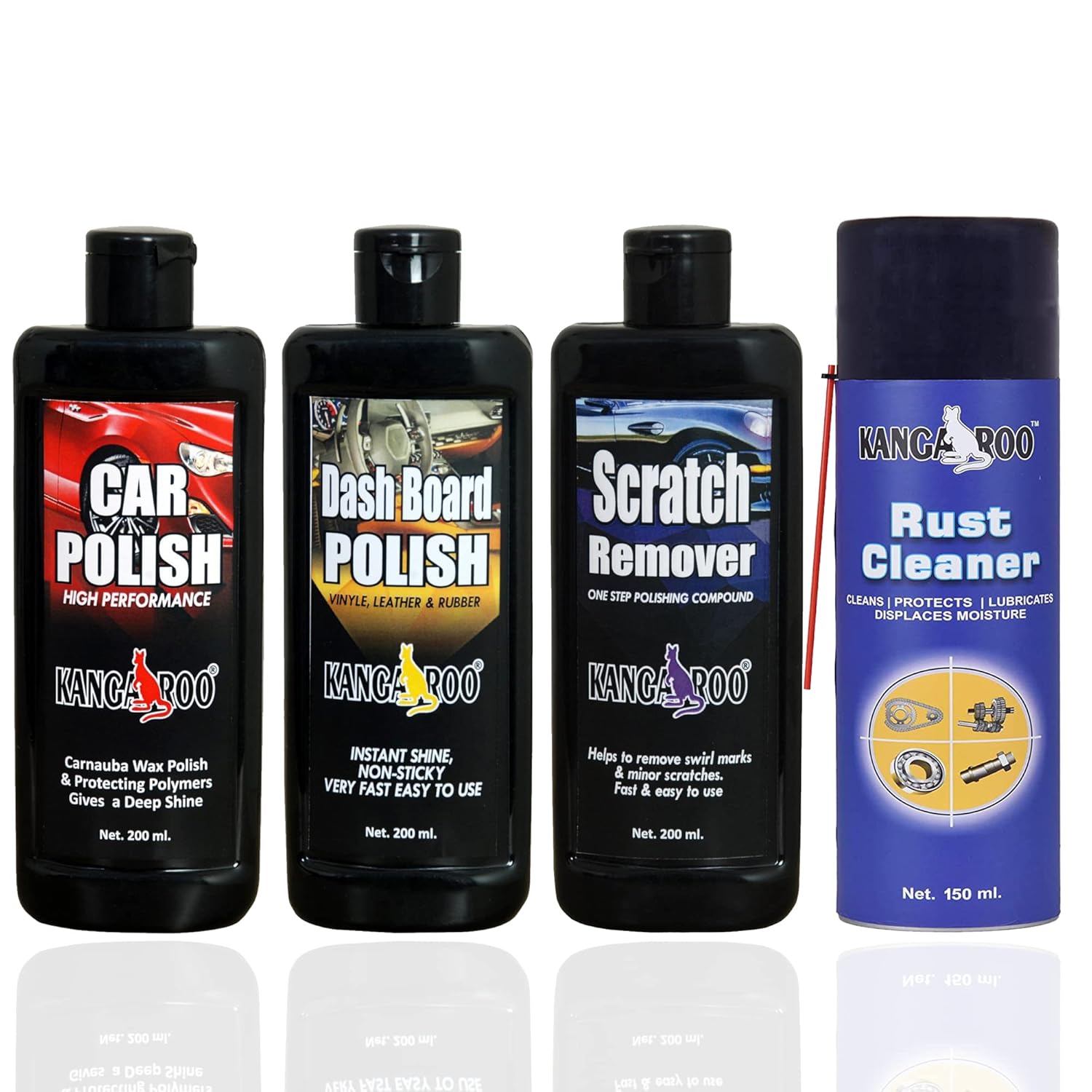 Kangaroo® Car Care Kit Include (Car Polish, Dashboard Polish, Scratch Remover, 200 ML Each and Multipurpose Rust Cleaner Spray