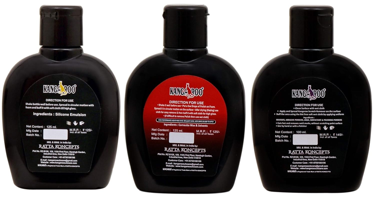 Kangaroo Car Polish, Dashboard Polish, Scratch Remover, Rat Repellent Spray 200ml Each, 2 Foam Applicators, 1 Multipurpose Microfiber Cloth