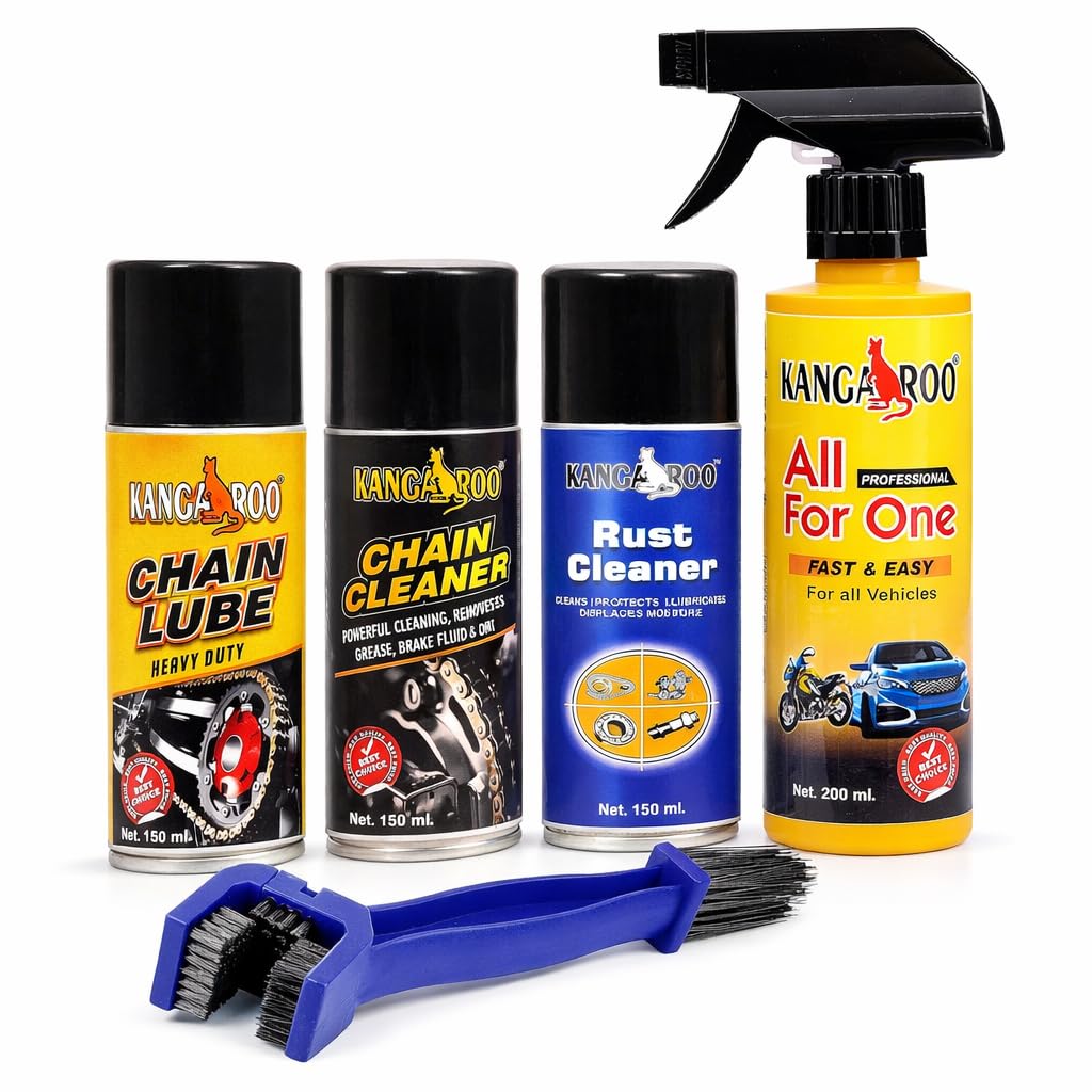 Kangaroo Bike Care Kit (Chain Lube And Cleaner Rust Remover And Bike Polish Full Care Kit 150 Ml Each Lubricant With Cleaning Brush And 200 Ml Polish (650 Ml Pack Bike Care Kit)