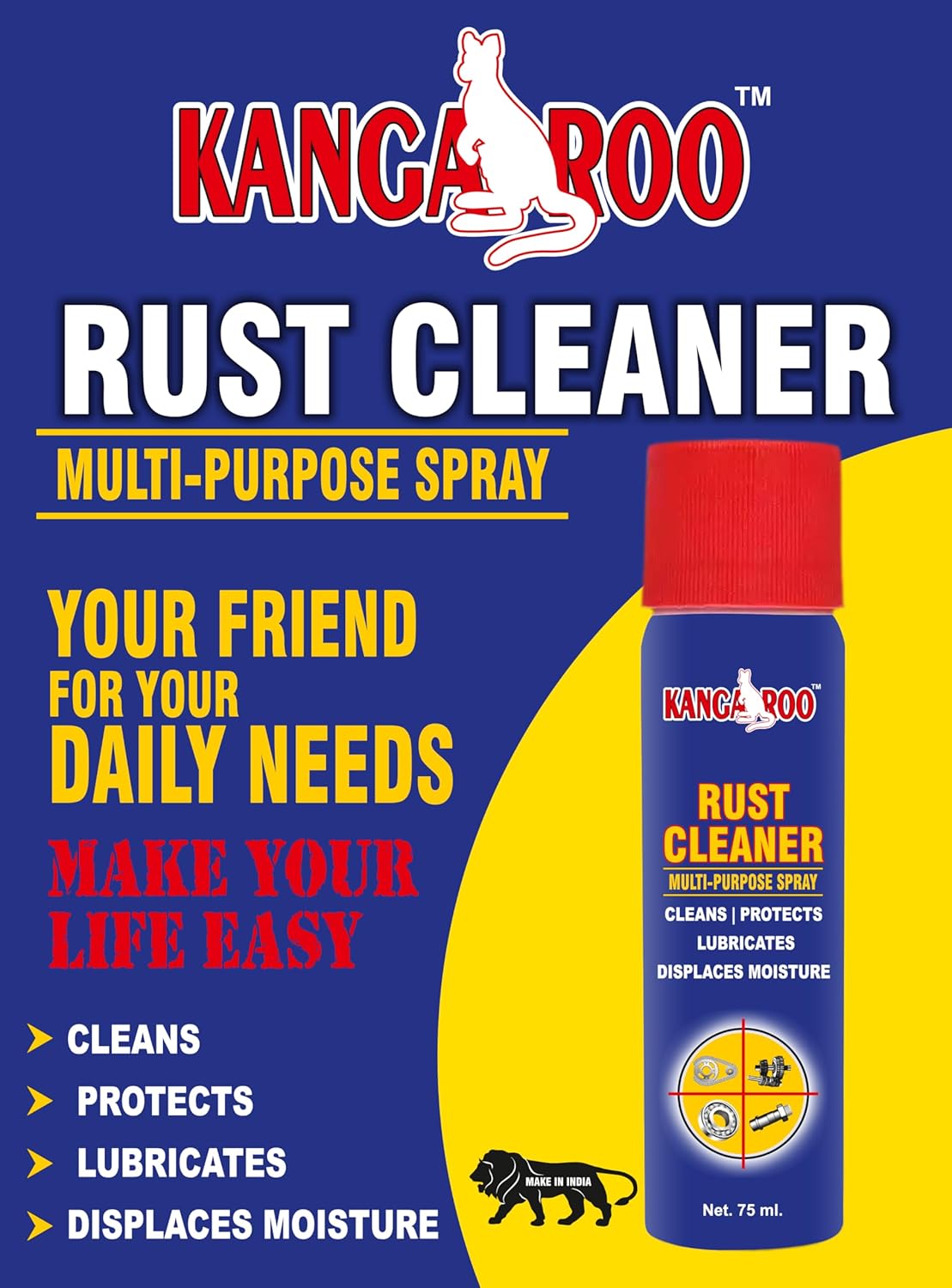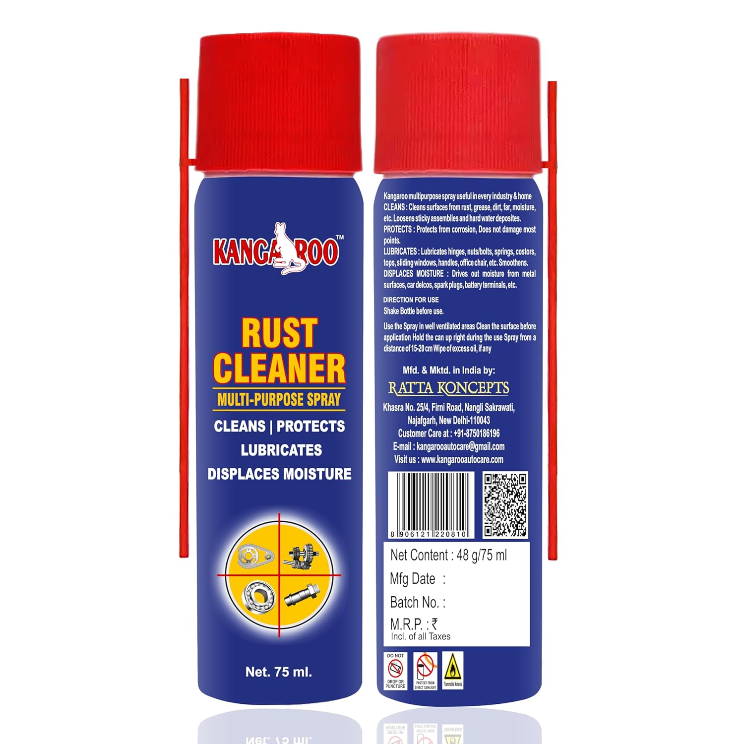 Kangaroo Rust Cleaner Spray 75 ml | Multipurpose Lubricant Spray | Cleans, Protects, Loosens Rust, Displaces Moisture | Rust Remover for Car, Bike, Tools, Hinges, Electricals